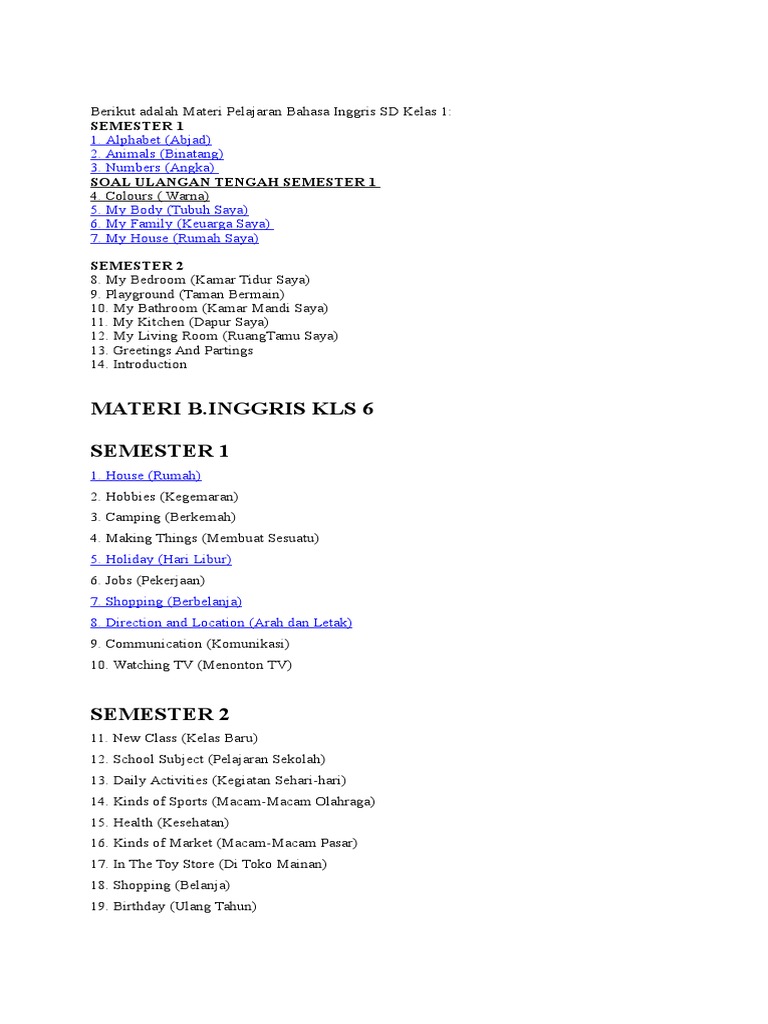 Berikut Adalah Materi Pelajaran Bahasa Inggris Sd Kelas 6
