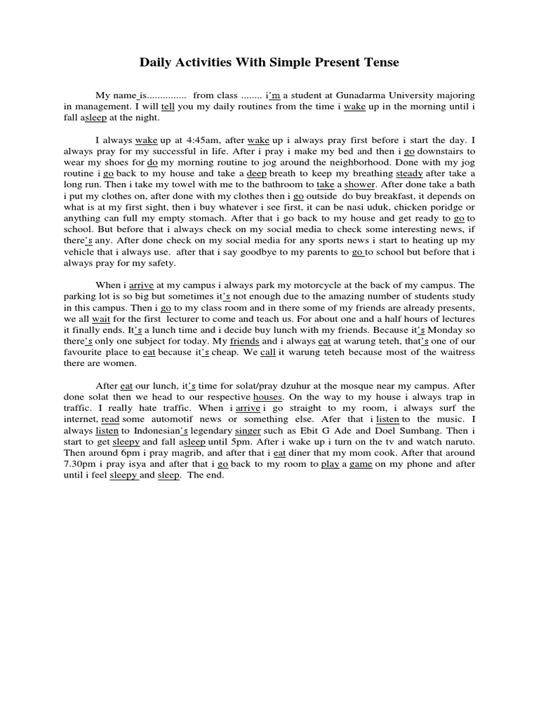 20210311 Contoh daily activity kegiatan sehari-hari menggunakan Simple Present Tense sebagai seorang pelajar mahasiswa anak kuliahan karyawan dan saat liburan. I am a student at Senior High School. Dengan EdLink kamu dapat mengedalikan gaya hidup dan jadi lebih nyaman dengan lingku.