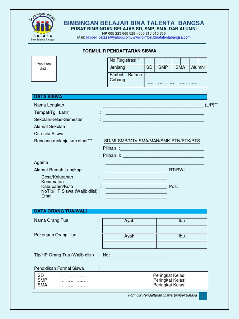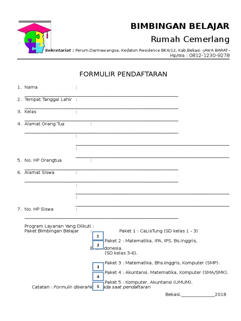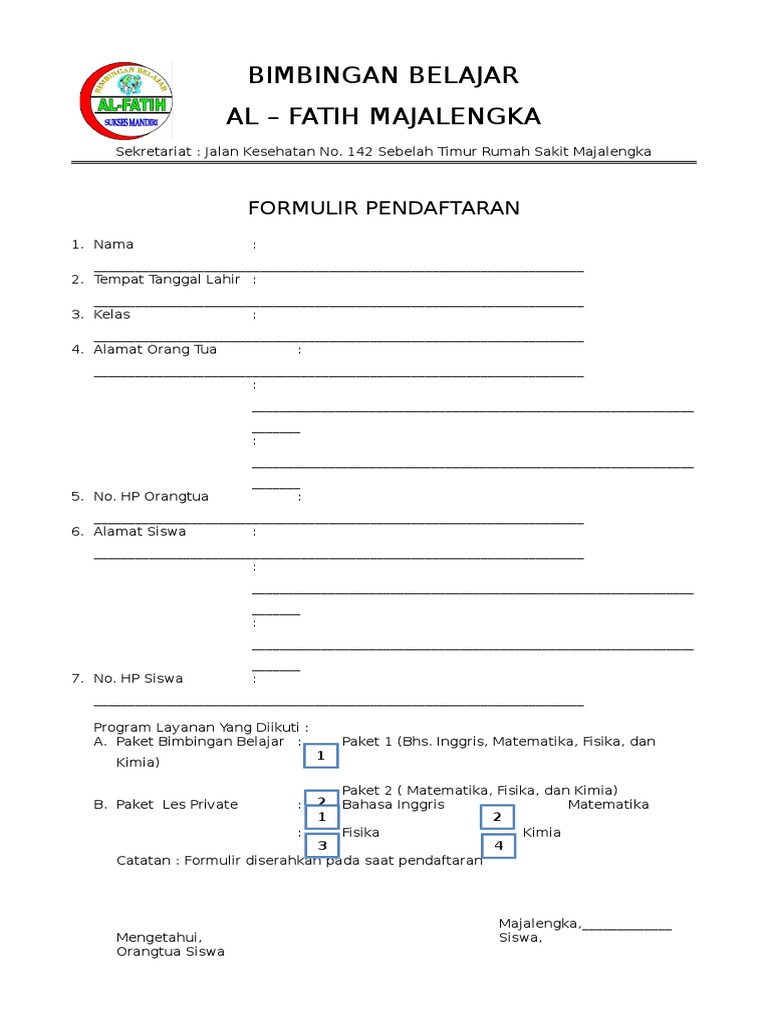 Contoh Formulir Pendaftaran Bimbingan Belajar