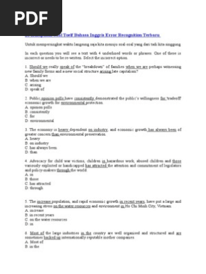 Free download kumpulan contoh soal toefl pasca sarjana terbaru gratis listening comprehension grammar structure and written expression reading writing. Contoh Soal Error Recognition 2010. Pada tes TOEIC yang sesungguhnya Jenis tes ini terdiri dari 10-20 soal peserta dituntut untuk memilih salah satu kata yang salah atau yang tidak sesuai dengan struktur kalimat yang tersedia.
